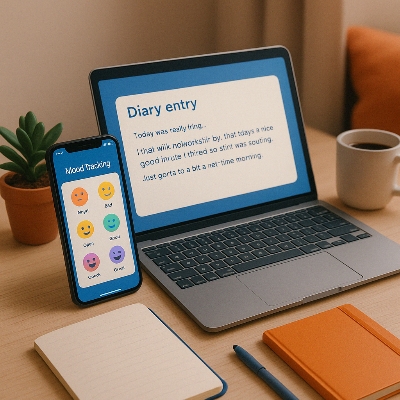 Z세대의 일상을 담은 디지털 셀프로그 공간. 스마트폰으로 감정 트래킹 앱을 사용하는 모습과 노트북 속 일기 화면이 어우러진 미니멀한 작업 공간이에요. 커피잔, 수첩, 식물 소품이 더해져 따뜻한 분위기를 만들어주죠.